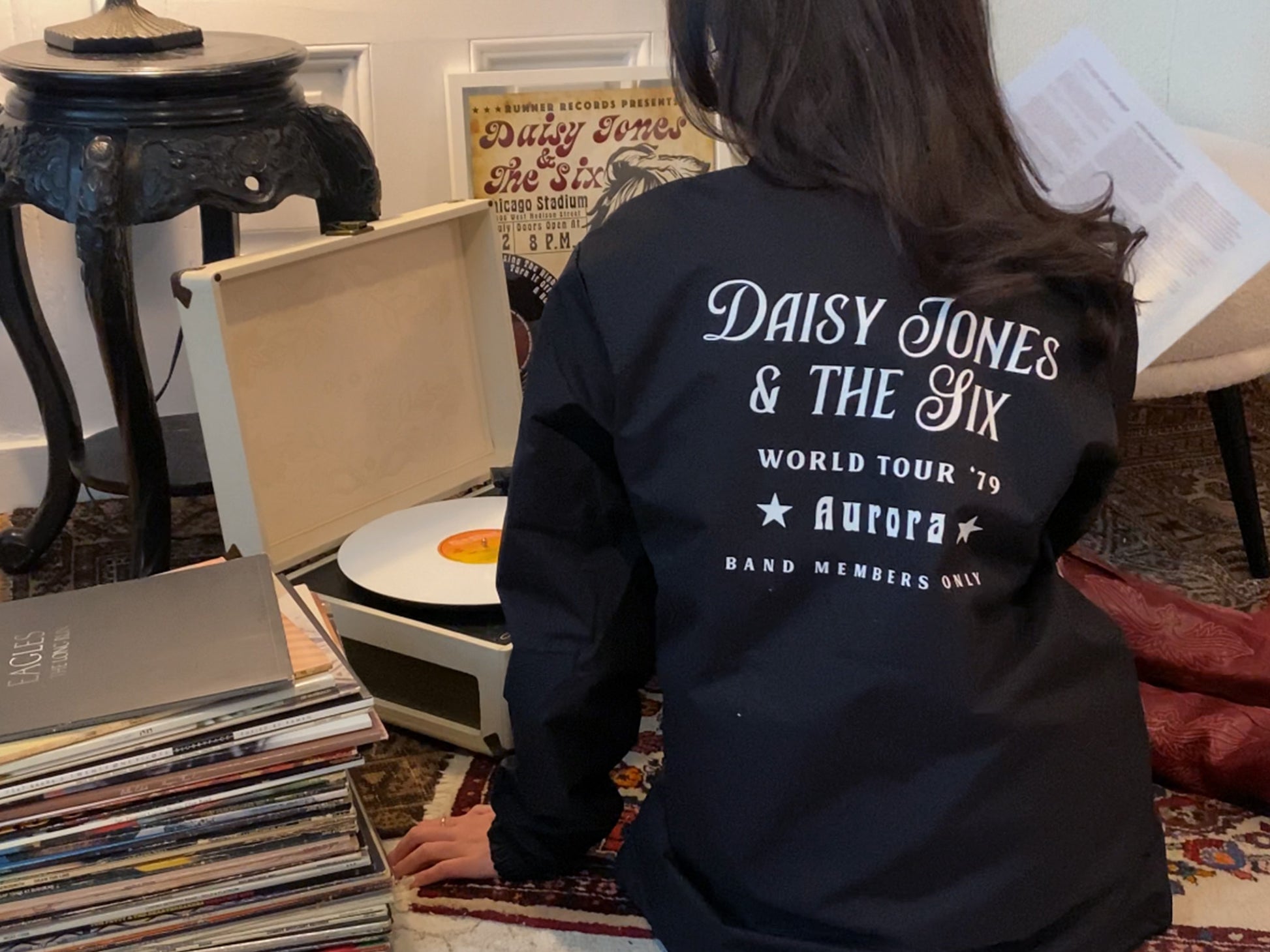 Available in black with white design on front and back. Features antique brass snap front closure. Drawstrings located at the hood and bottom opening.