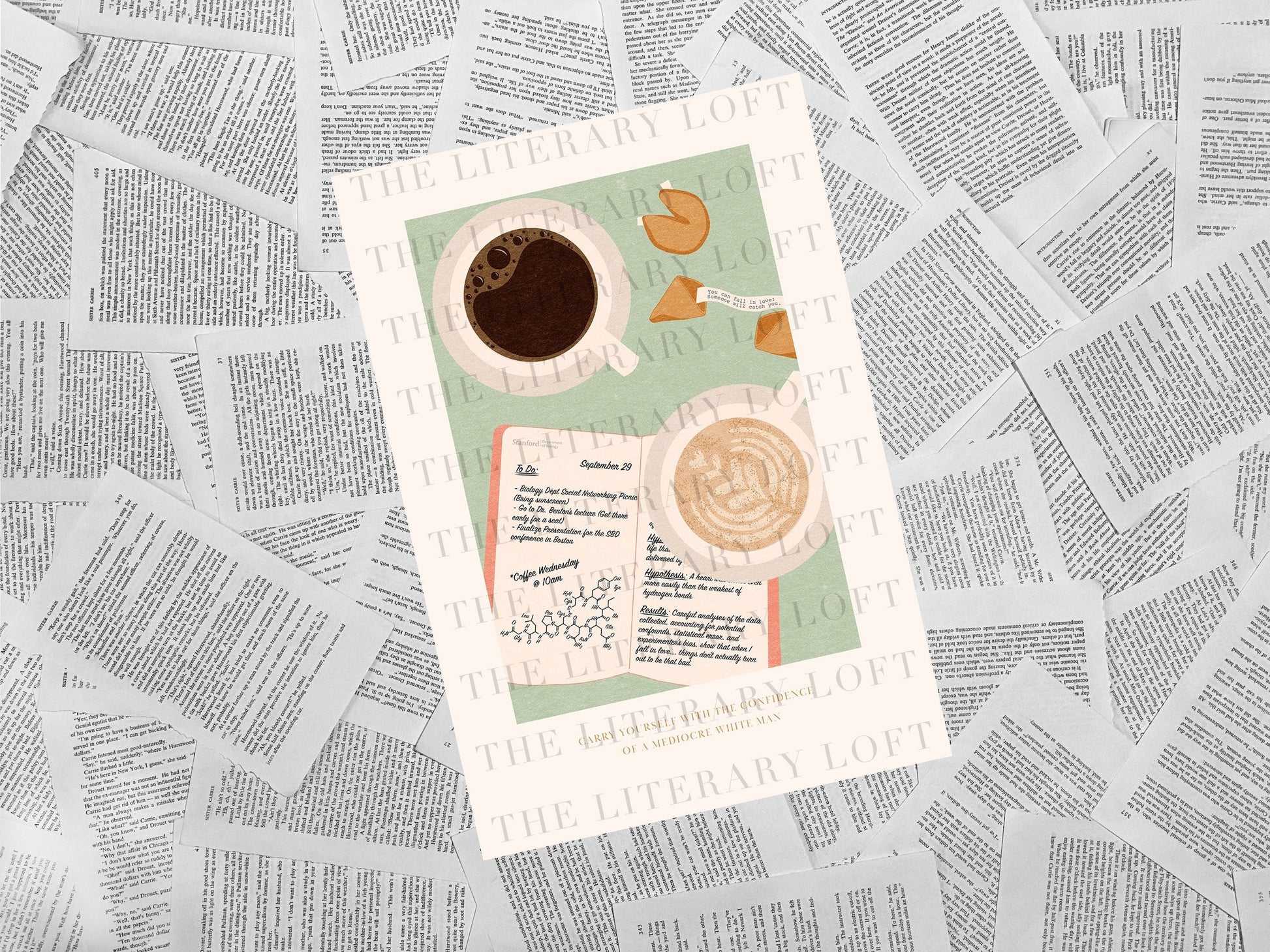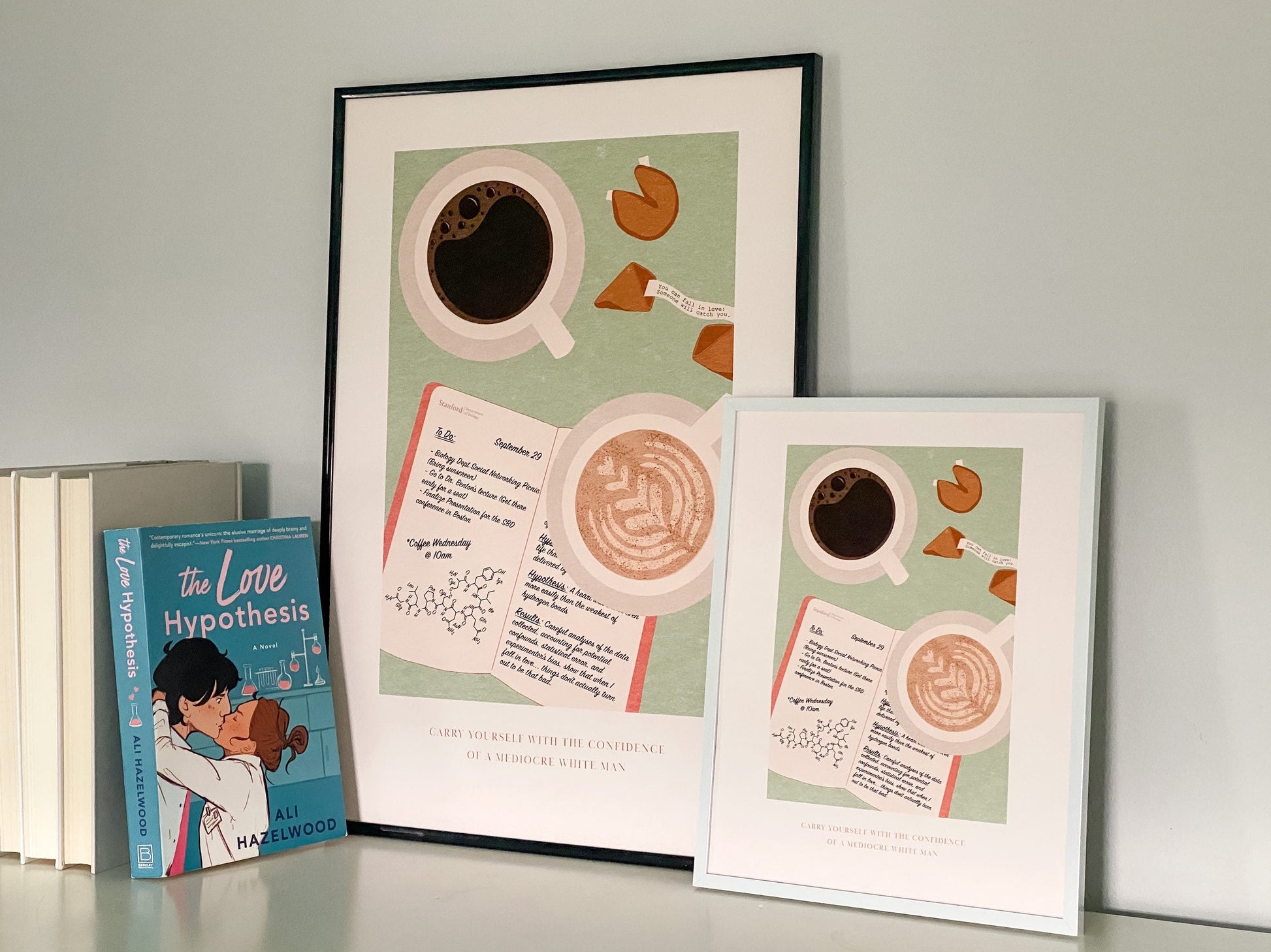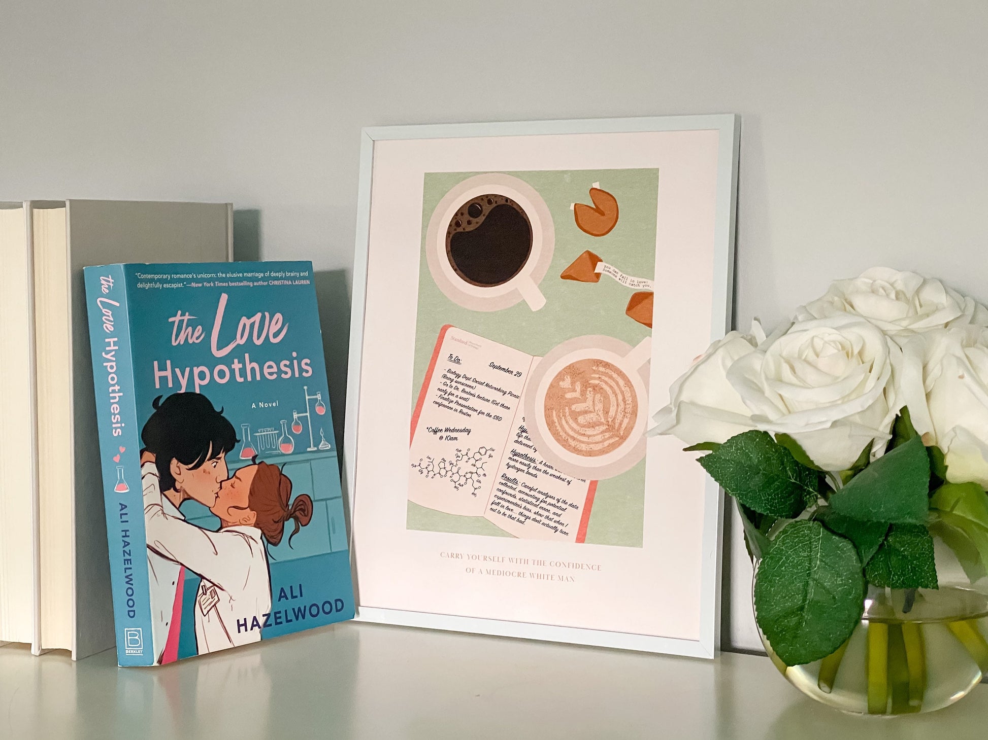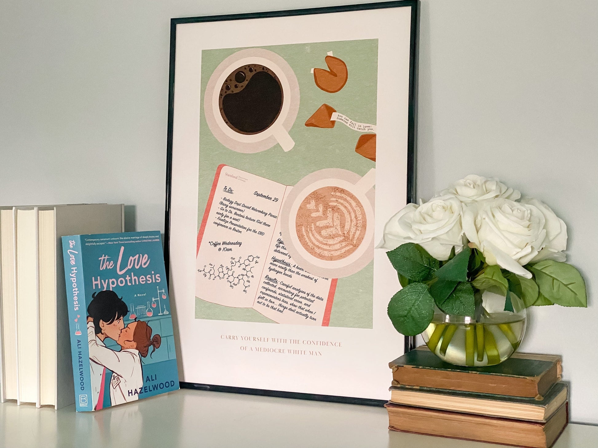 Details include Adam's black coffee, Olive's pumpkin spice latte, their fortune cookies, September 29 (the deadline), the chemical formula for love (Dopamine + Serotonin + Oxytocin), a to do list including key parts of the book and three quotes. It features a texture printed over the image to give a vintage look.