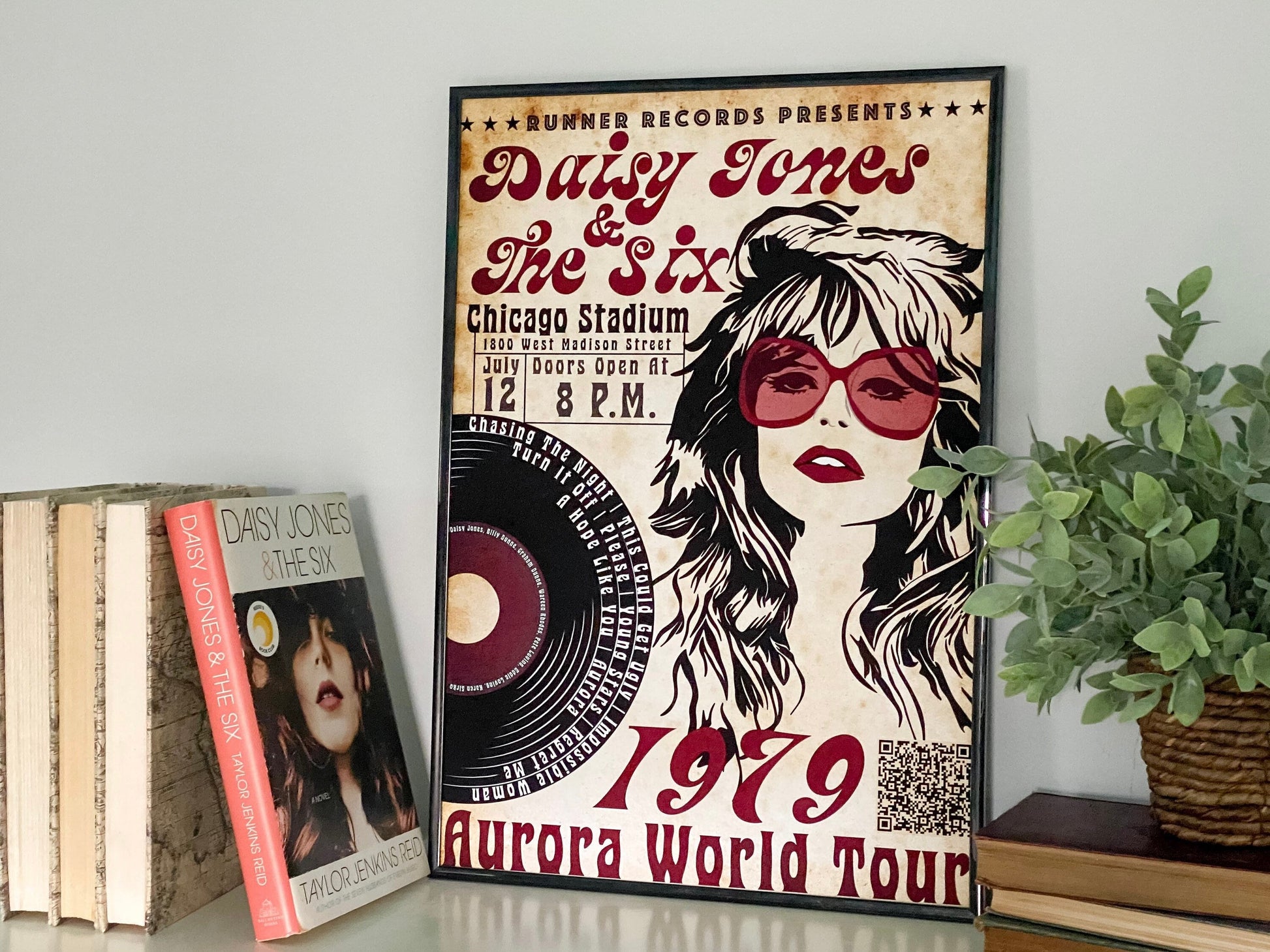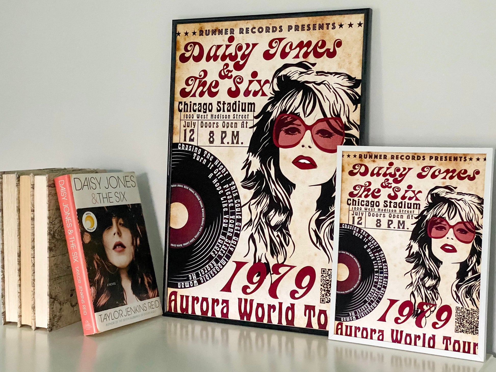 This print is a concert poster for the 1979 Aurora World Tour Chicago Stadium show. The poster features a scannable QR code that pulls up a spotify playlist with curated songs, a record with all the song titles and band members listed, the record label "Runner Records" and a printed texture to give the poster a vintage look.
