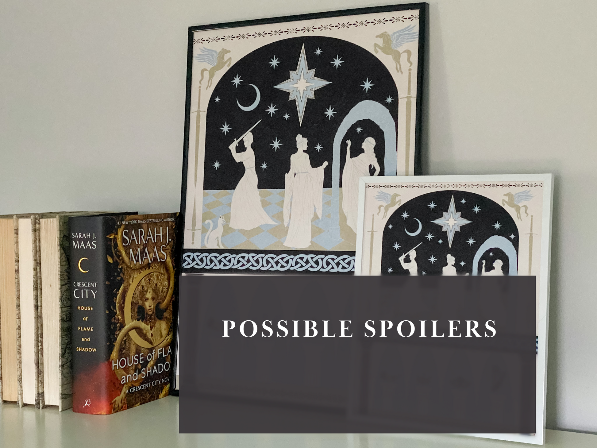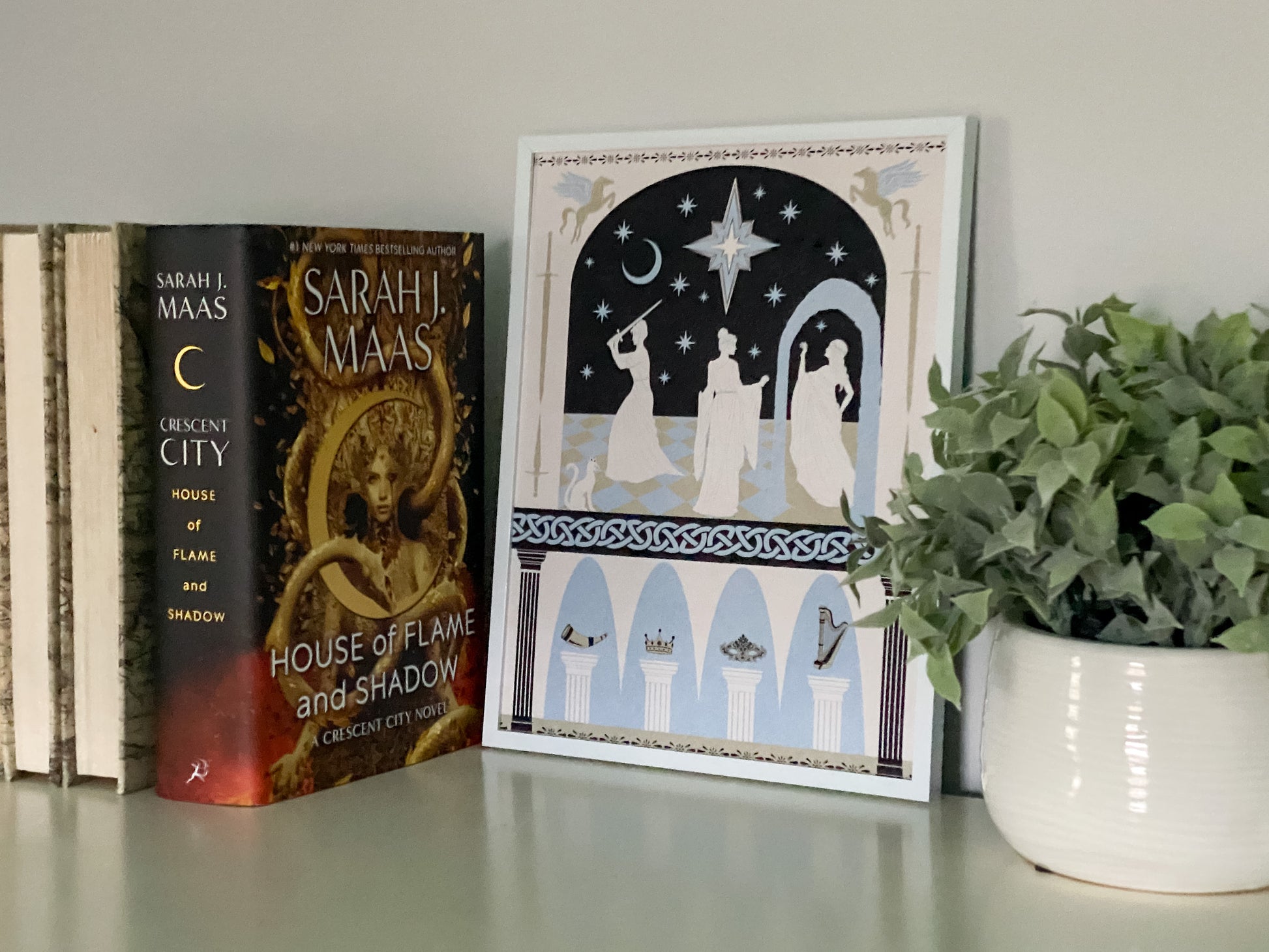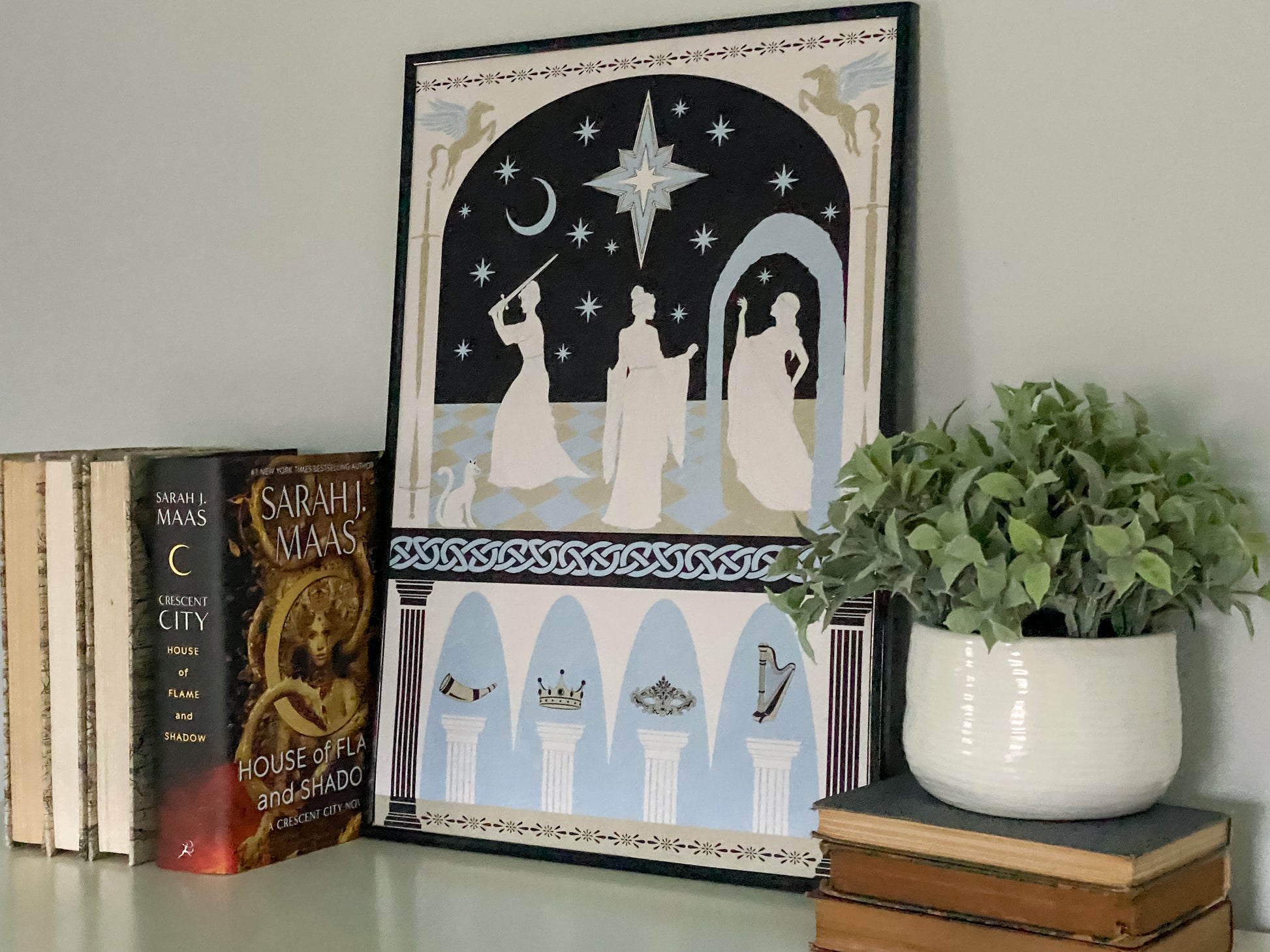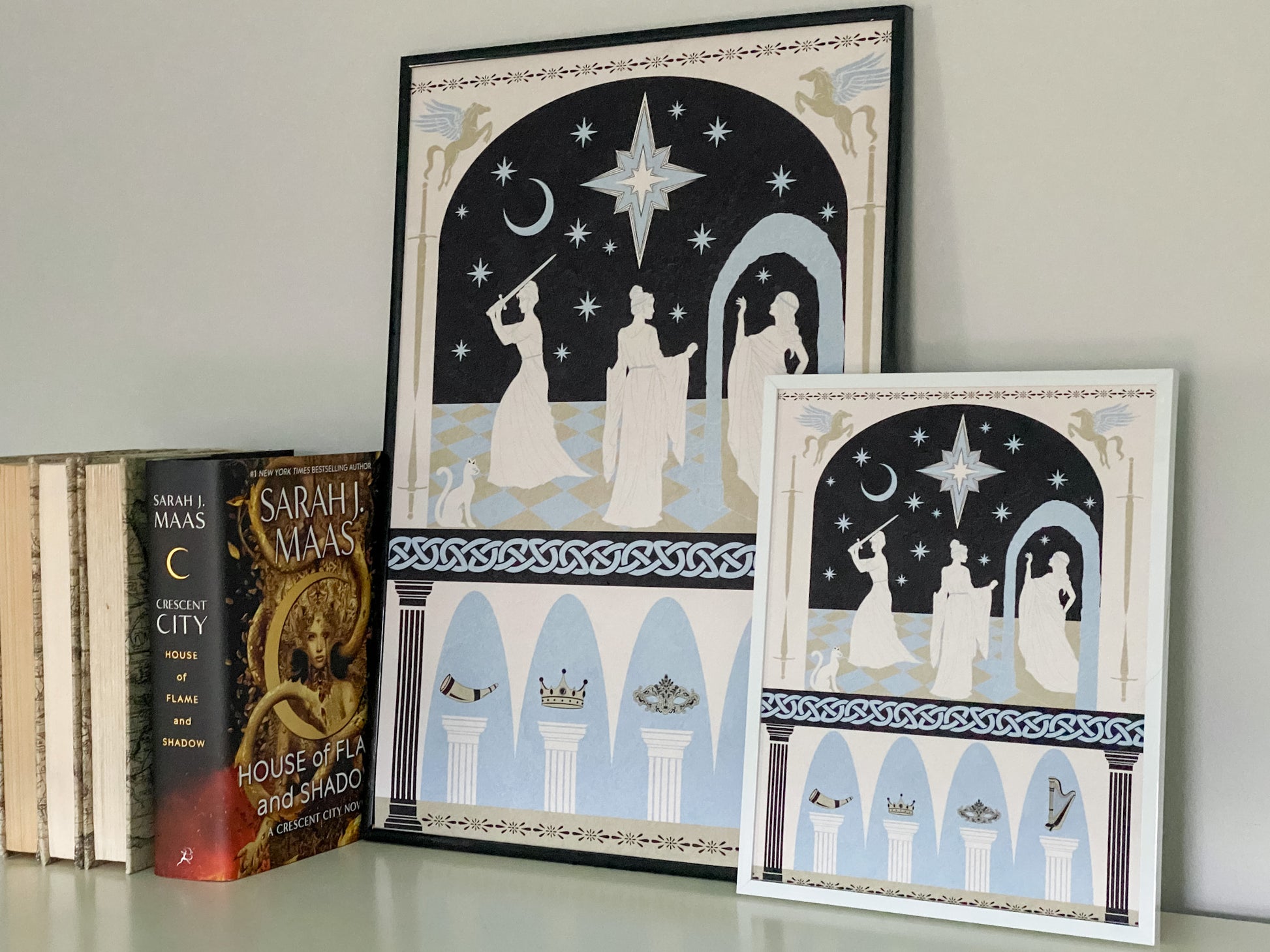 This print is inspired by the cave carvings and Silene's storytelling. It depicts Queen Theia and her daughters while Aidas is by her side. The twin dagger and sword are bordering the scene while the dread trove sits on pillars below and pegasuses are flying above. It features a subtle rocky texture printed on it to represent the cave walls.