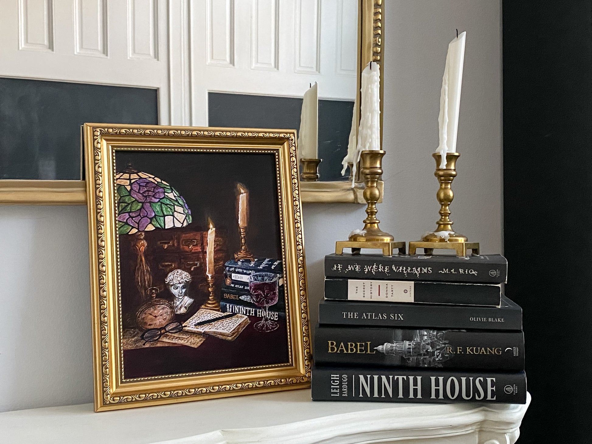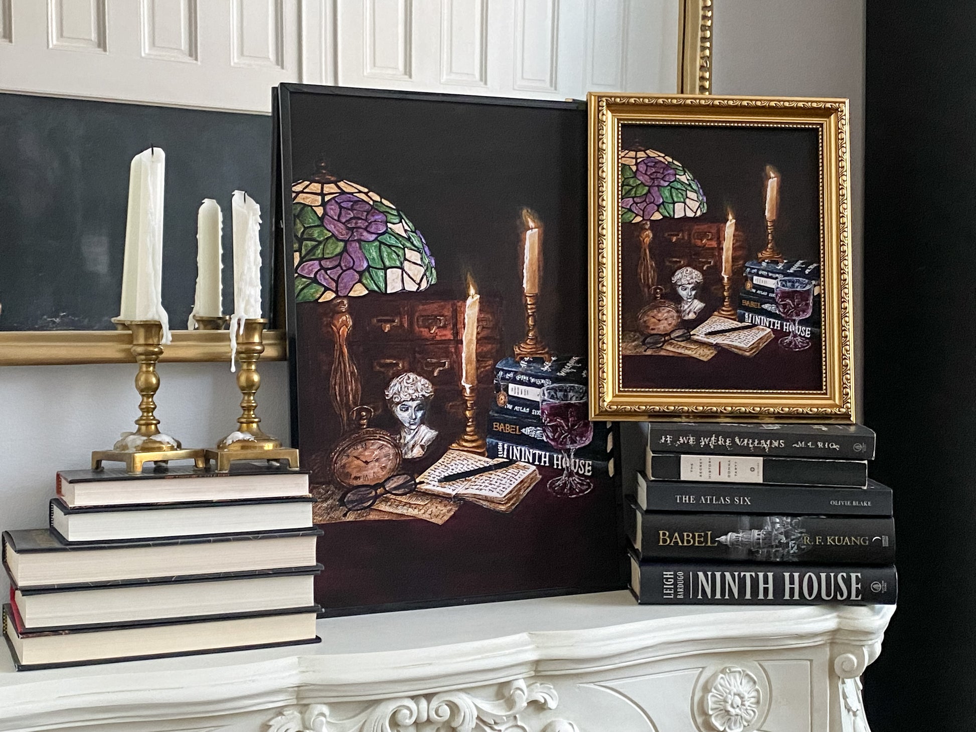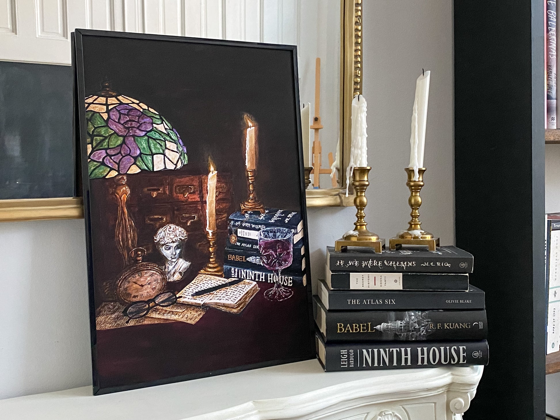 'Ink and Moonlight' is a still-life painting that captures the nightstand of a perfect evening for a dark academia reader.