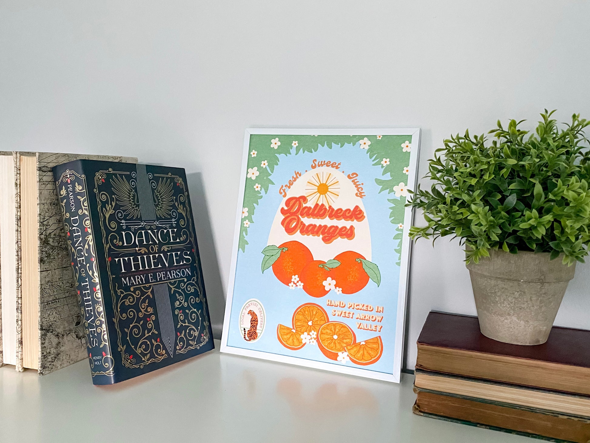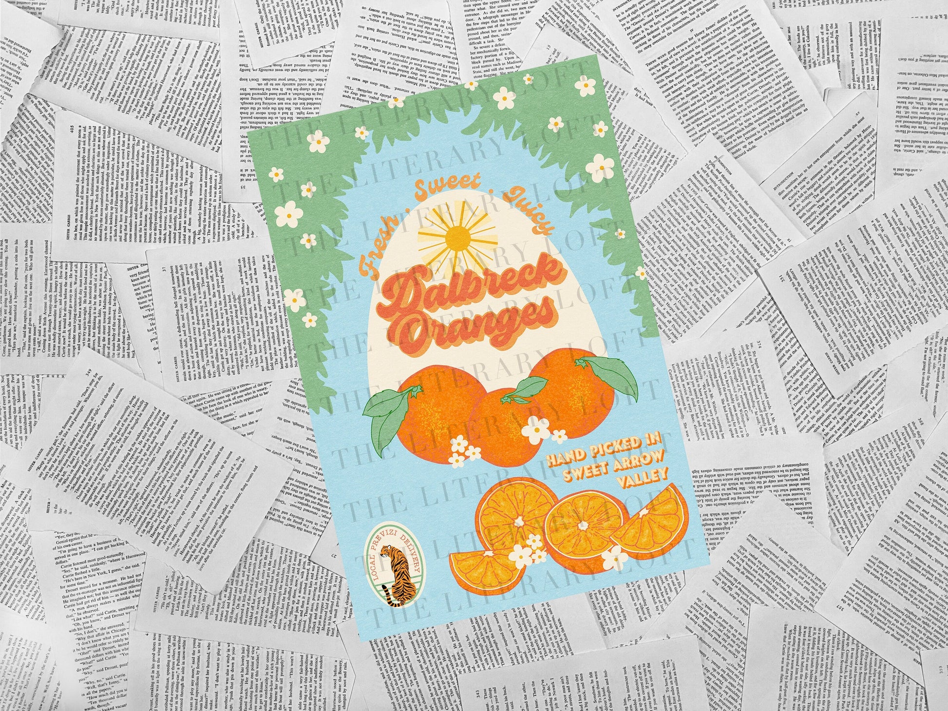 This print is inspired by Kazi’s love of oranges. Some details include the meaning behind her name- "Sweet Arrow", "Previzi" delivery, Four stripes on the sticker representing the stripes on their wagons, and a Tiger for Kazi's largest steal. It also features a texture printed over the image to give a vintage feel.