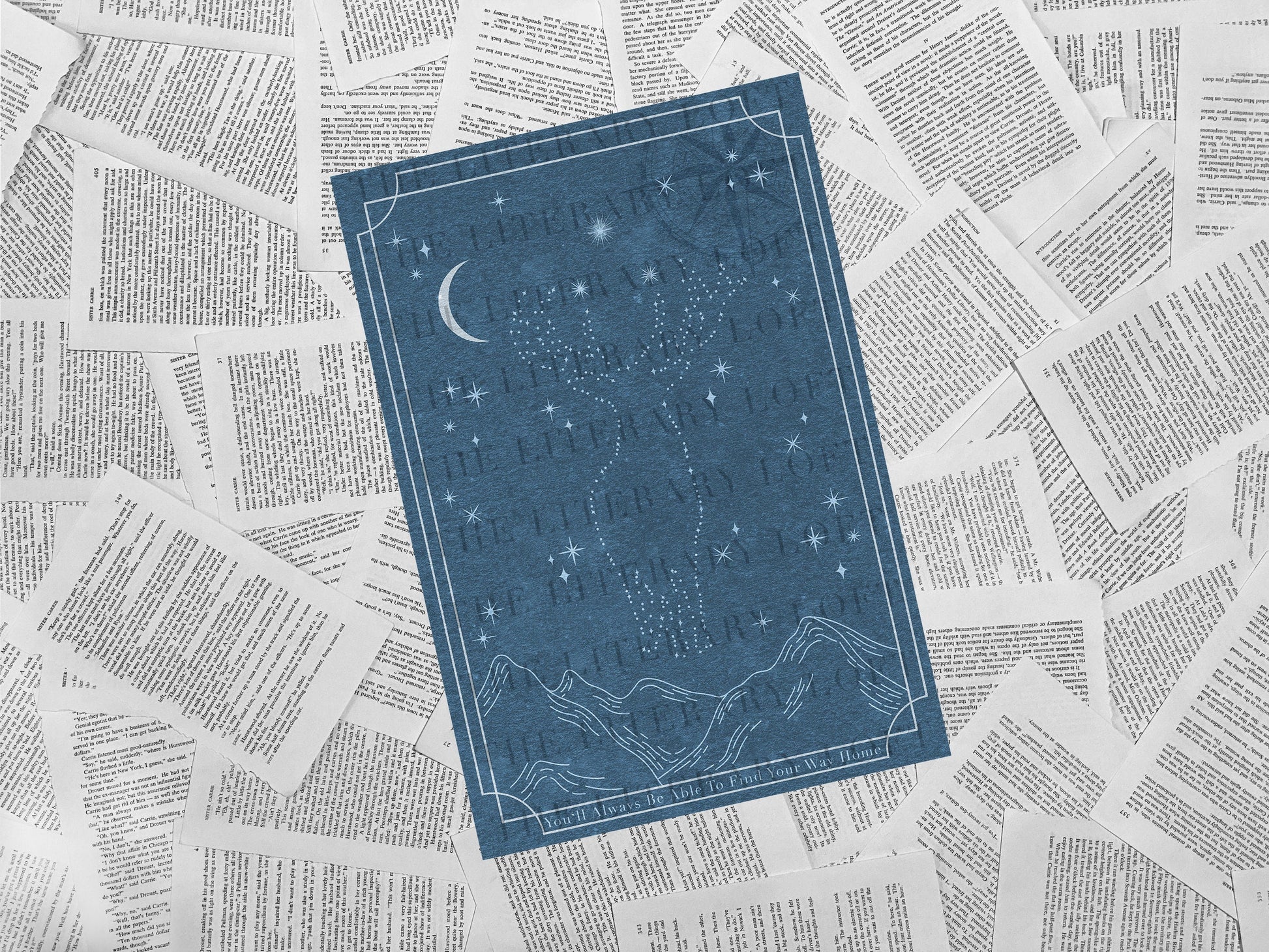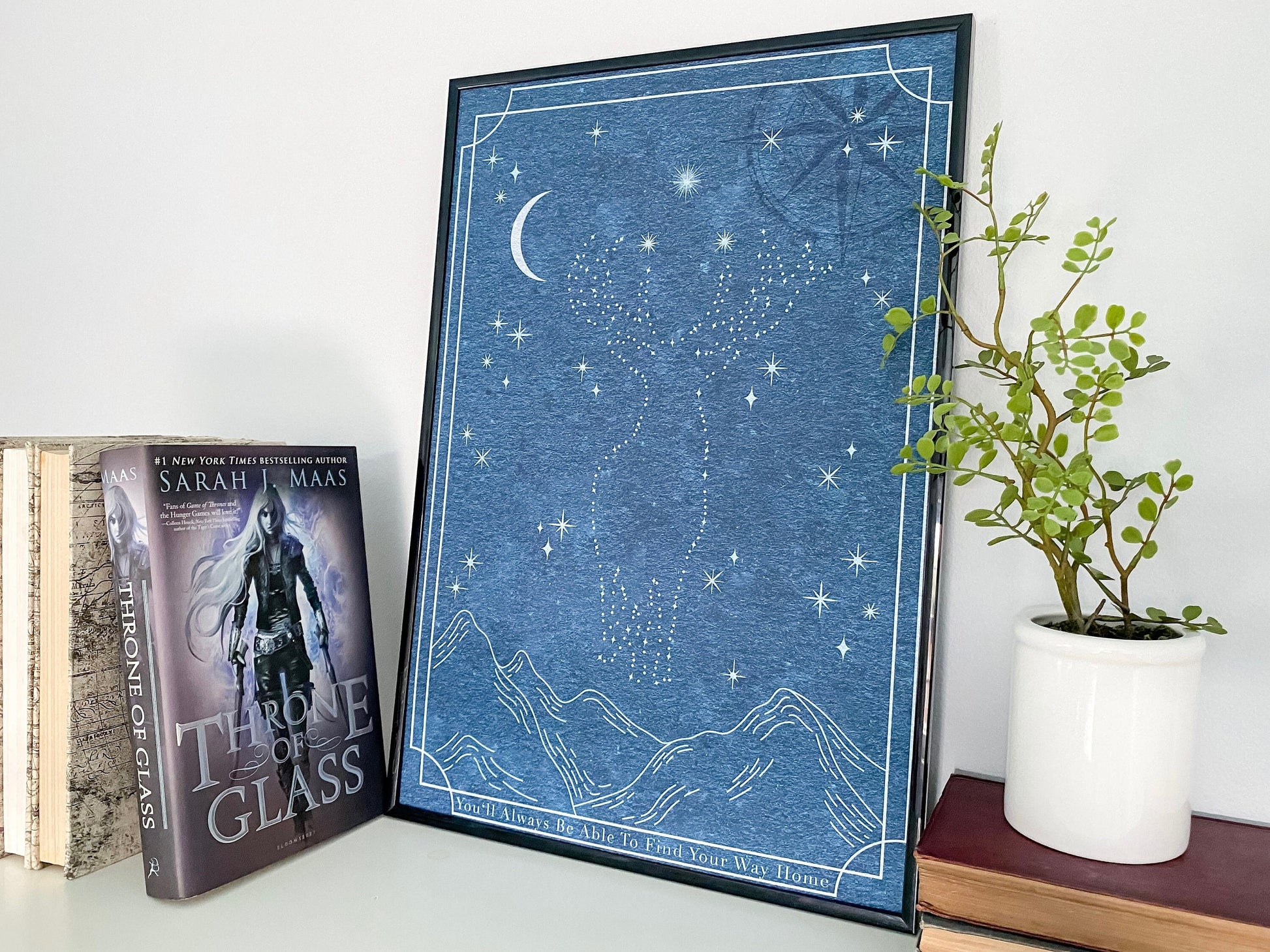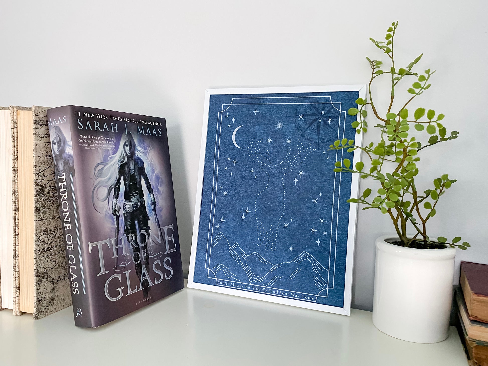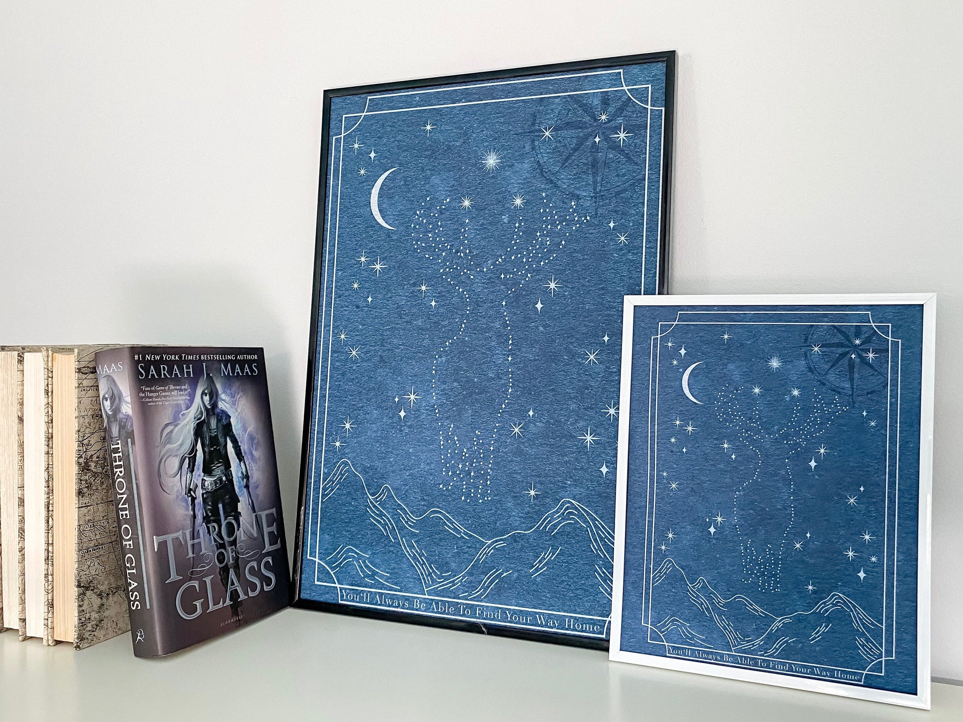 This print is inspired by the Terrasen stag constellation of the with the northern star as the crown. The print also features the Terrasen mountain range, a compass rose, and the Quote "You'll always be able to find your way home." It has a textured overlay to give it a vintage look.