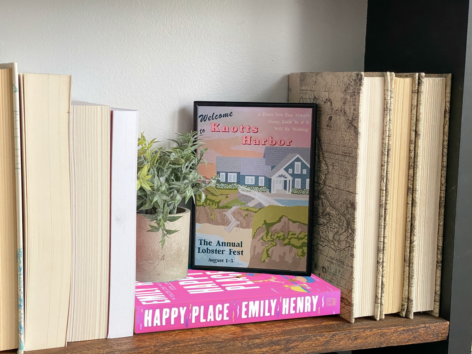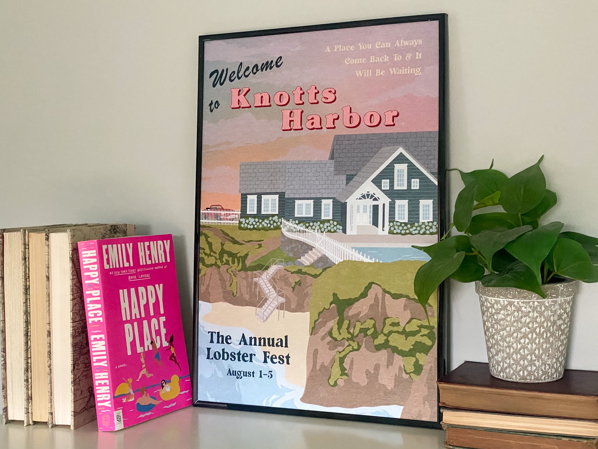 Details include the summer cottage located in Knotts Harbor, Maine with the old, cherry red jaguar is parked in the drive, the cliffs leading down to the beach, a quote, and reference to the iconic Lobster Festival. It features a texture printed over the image to give a vintage look.