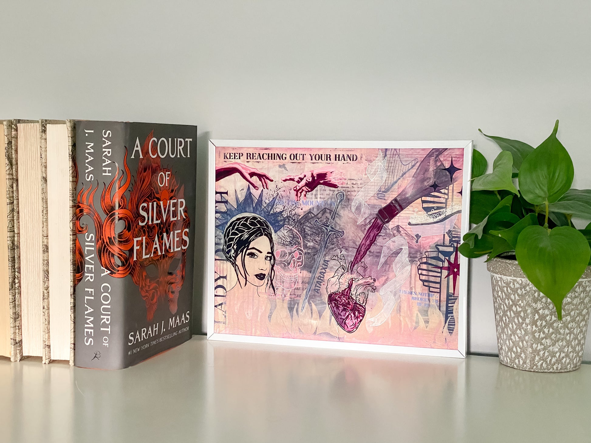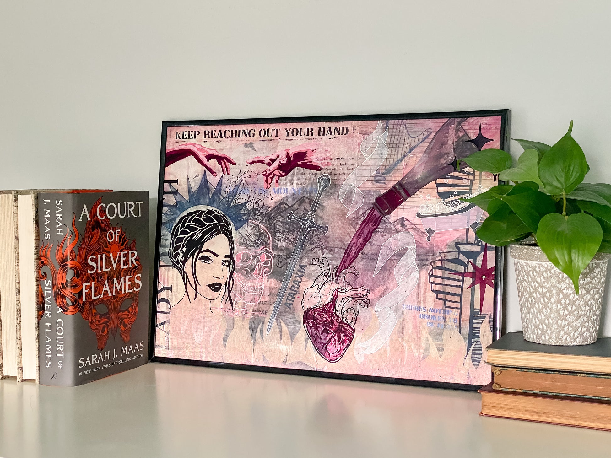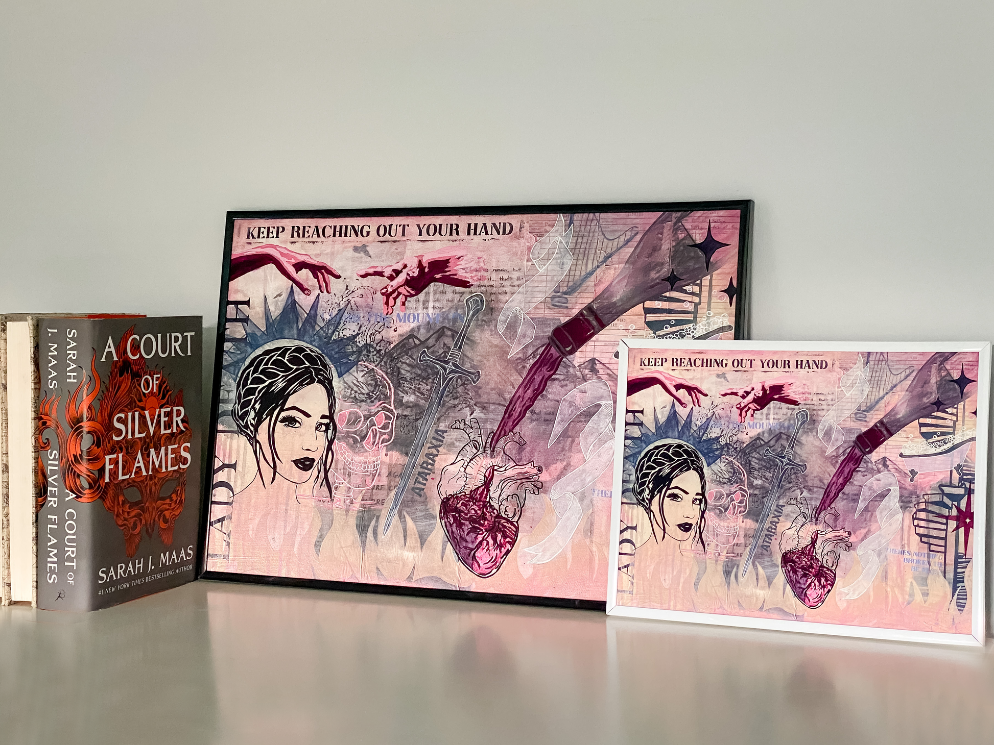 This print features many hidden easter eggs including house of wind library cards, items of the dead trove, a cut valkyrie ribbon, a winding stair case, the bargain star tattoo, and more