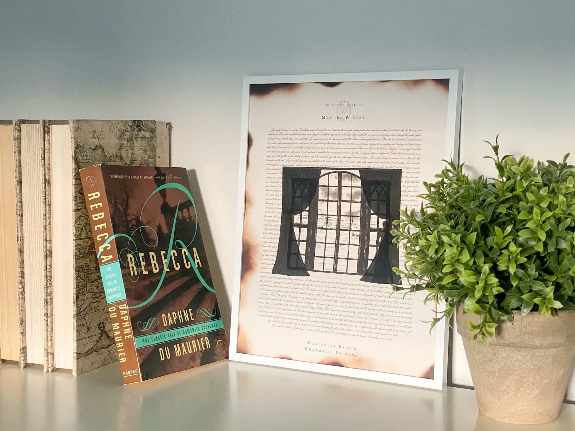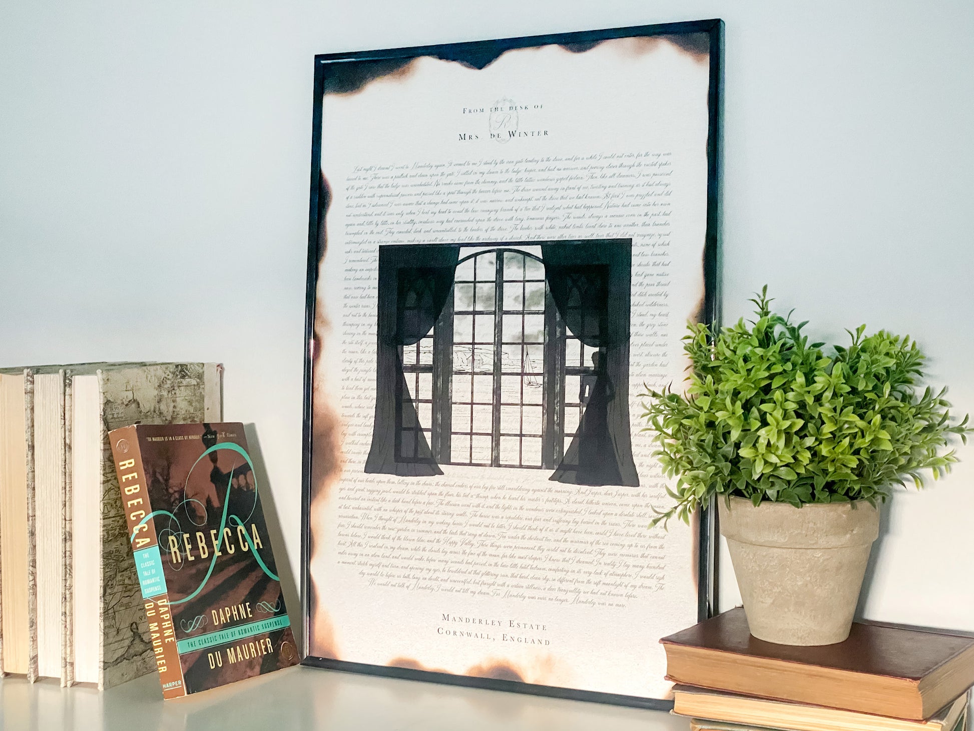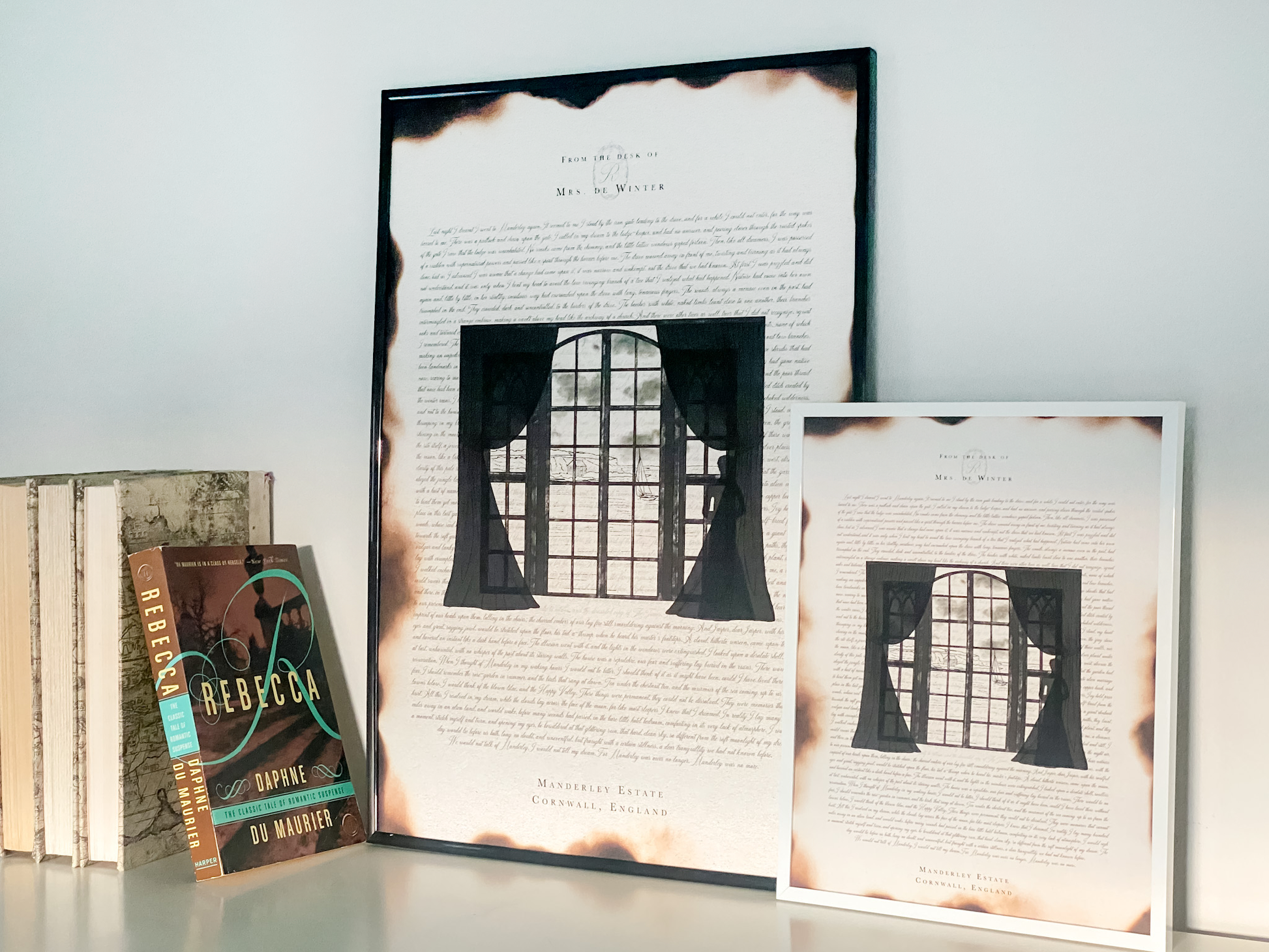 Details include burned letterhead stationary from the desk of Rebecca, the window from her old room facing the sea, her sailboat and the boat house and a figure watching through the window.