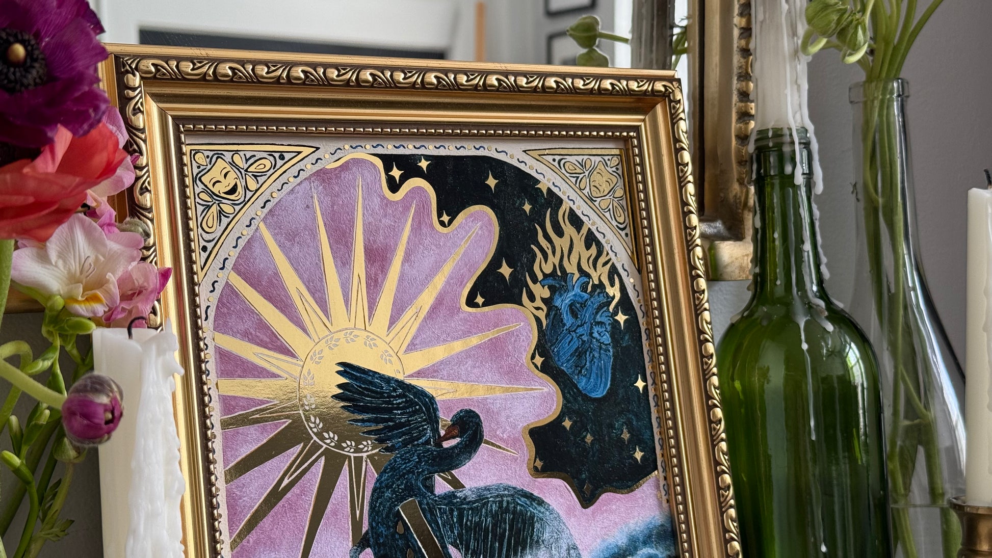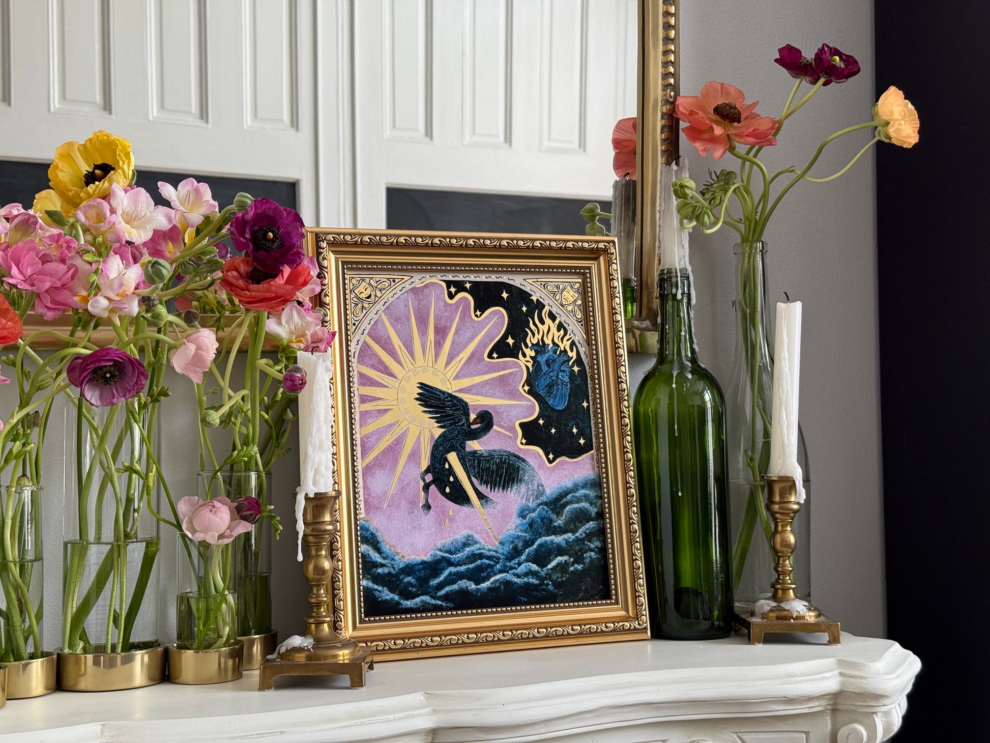 Inspired by the “Grumpy x Sunshine” literary trope, this painting depicts a black swan flying through a storm and being pierced in the heart by ray of sunshine.