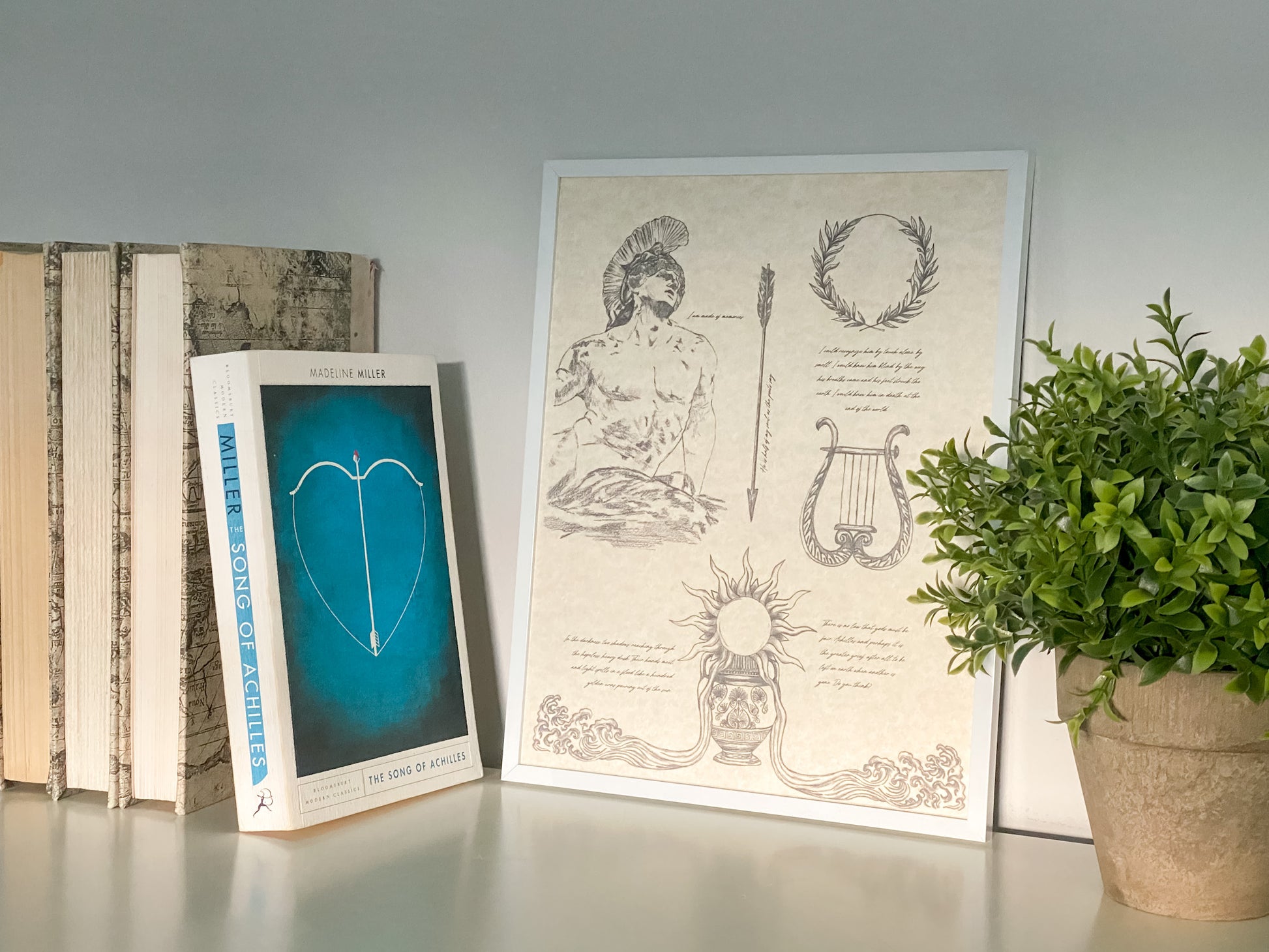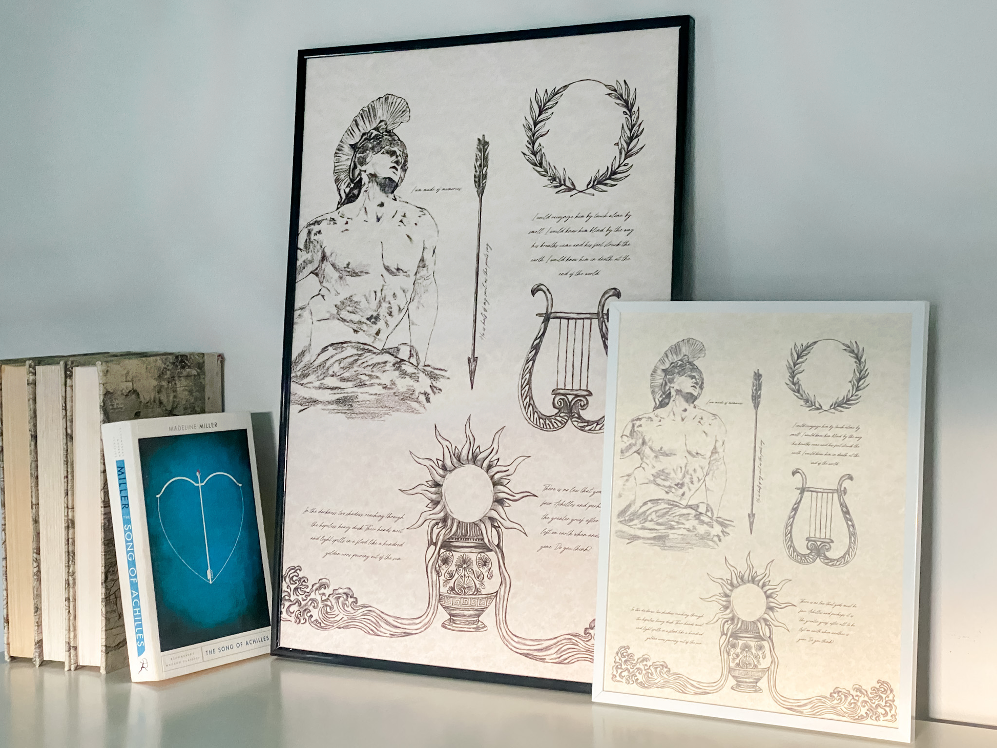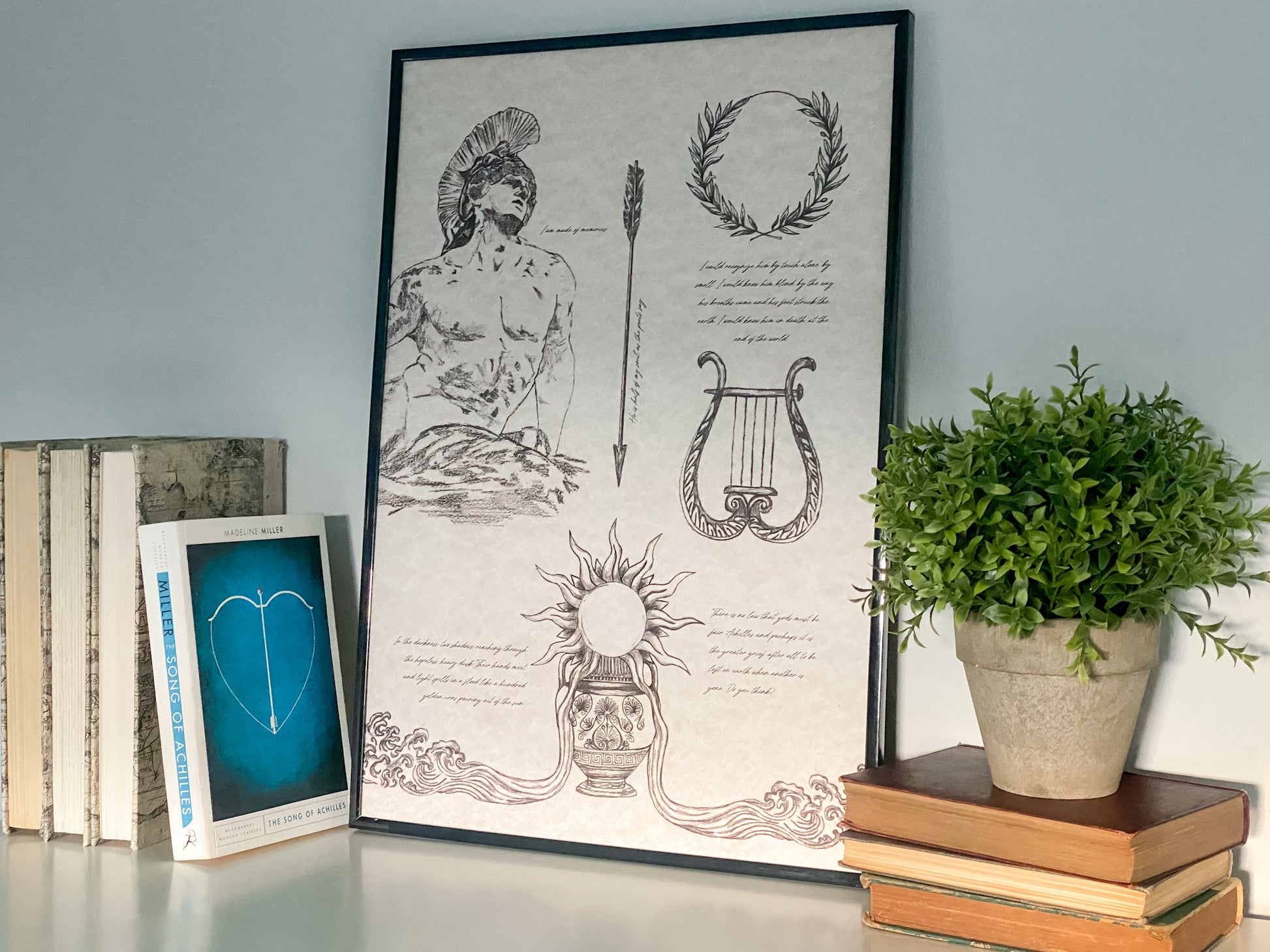 Details include sketches of the Dying Achillies statue, the fatal arrow, a harp, an olive branch crown, and a depiction of a quote.