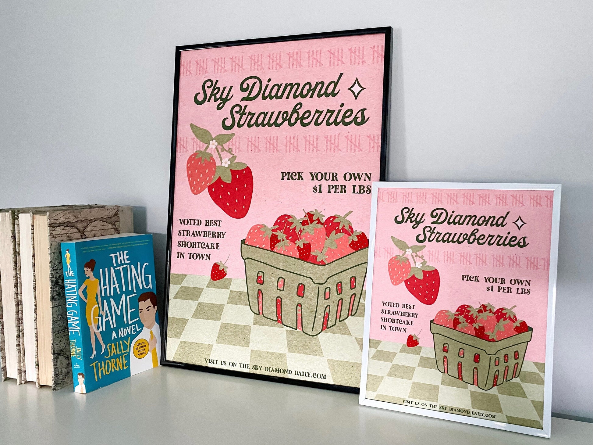 This print is inspired by Lucy's parents strawberry farm. Some details include her mom's blog listed at the bottom, "Shortcake" Lucy's nickname, and tally marks representing the marks in Joshua's planner. This print features a textured overlay giving it a vintage look.