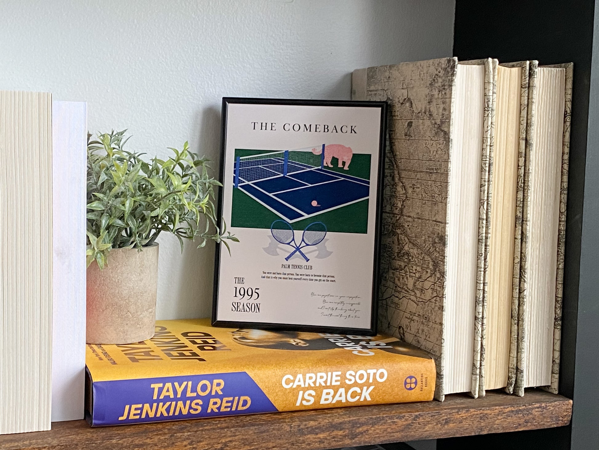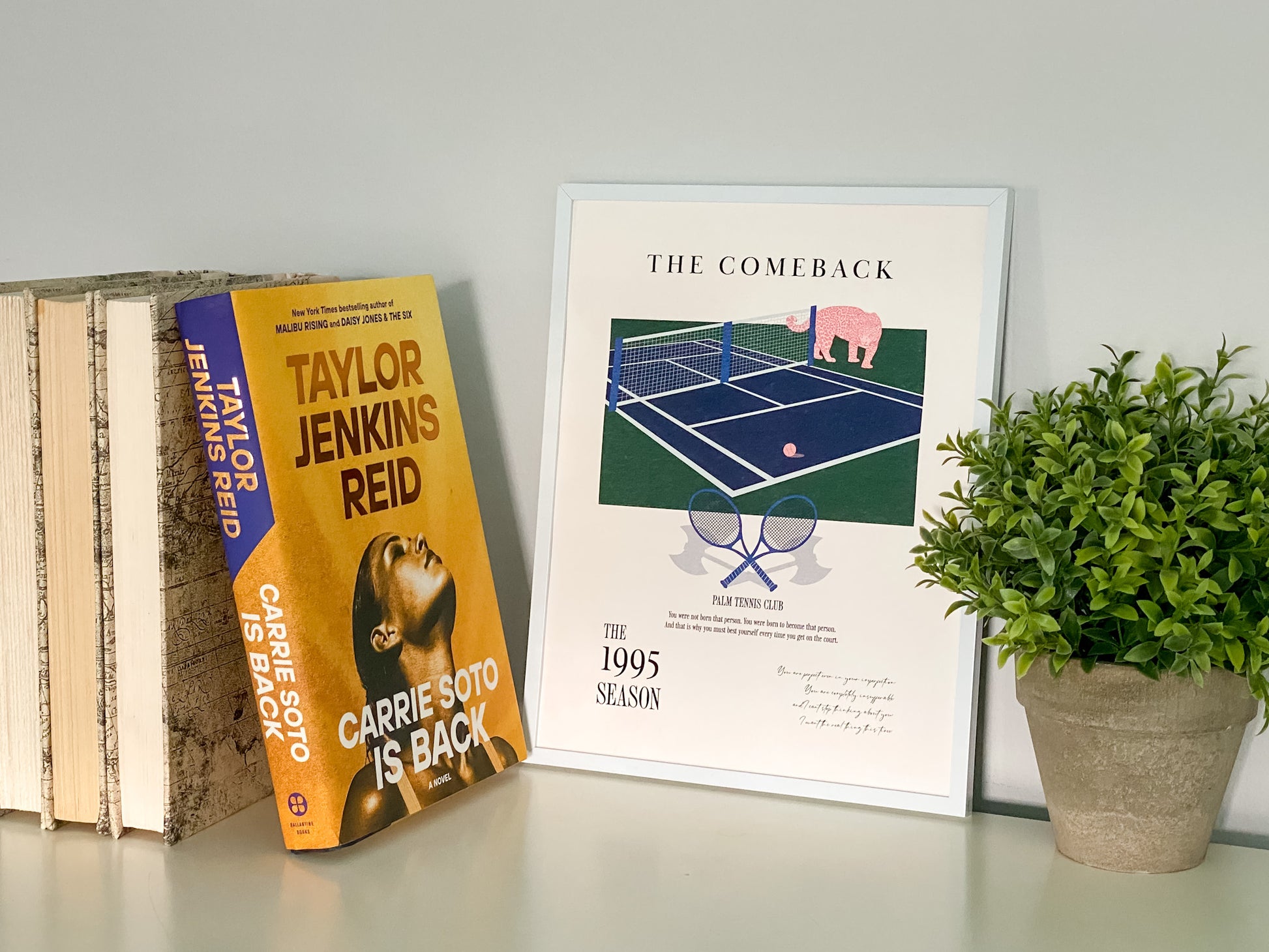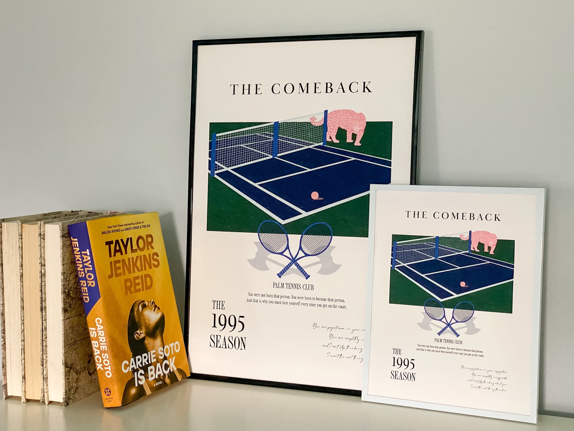 Details includes the jaguar on the sidelines, battle axe shadows under the tennis rackets, Bowe's note and quotes from the book. It features a texture printed over the image to give a vintage look.