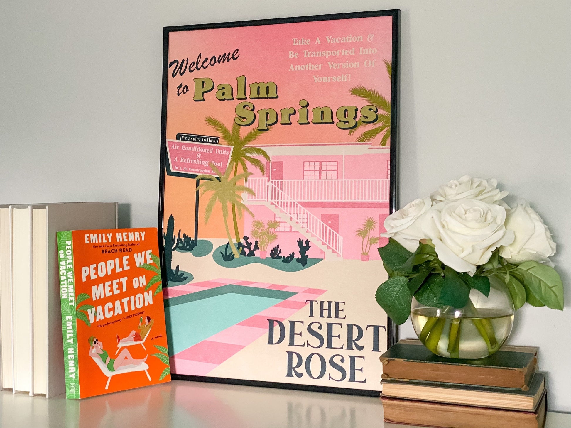 Details include the apartment complex The Desert Rose located in Palm Springs and a saying referencing a quote from the book. The sign reads "We aspire to have... air conditioned units and a refreshing pool in a no construction zone" referencing the key issues in the book. It also features a texture printed over the image to give a vintage feel.